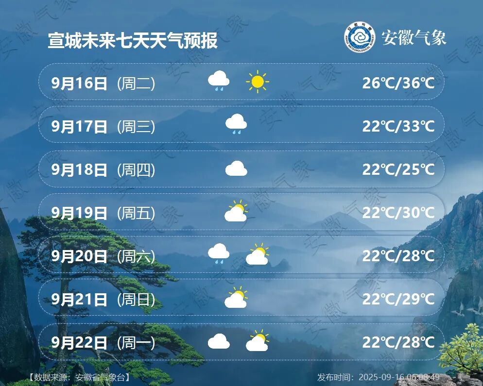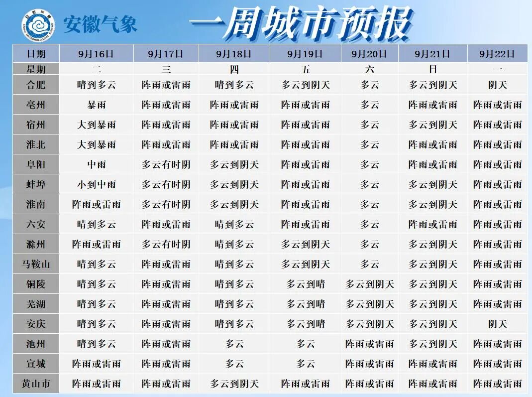 21日(周日):全省多云到阴天,其中淮北地区、大别山区和江南部分地区有阵雨或雷雨。