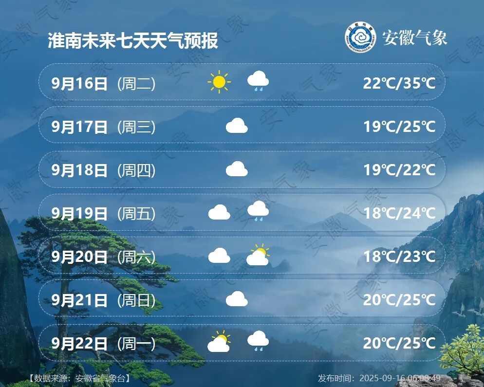 19日(周五):沿淮淮北和大别山区阴天有阵雨或雷雨,其他地区多云到晴天。