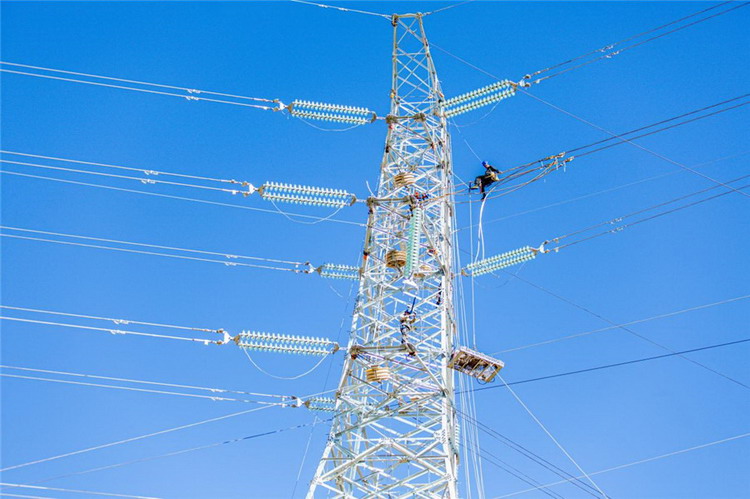 11月25日,在安徽省淮北市烈山区古饶镇刁山村,濉溪—凌云220千伏线路N48—N54号铁塔之间的导地线展放施工现场,地面五六名施工人员使用牵引机和张力机,通过牵引绳将导线输送到铁塔上,在53米高的铁塔上,两名施工人员正在开展导线压接、紧挂线工作。