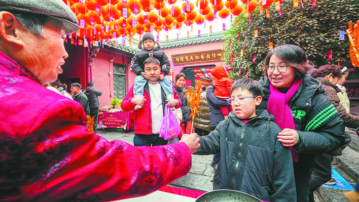 城隍庙大院的主舞台上,首场贺新春文艺演出精彩上演,吸引了大批市民游客驻足观看。