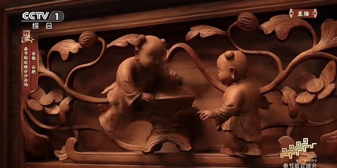 鱼灯是安徽本地的传统新春民俗,随着“摸摸鱼头、万事不愁,摸摸鱼尾、顺风顺水”的吆喝声,光影流转间,演员马思纯与象征着家庭和睦、美满的徽派木雕“和合童子”完成了合掌。