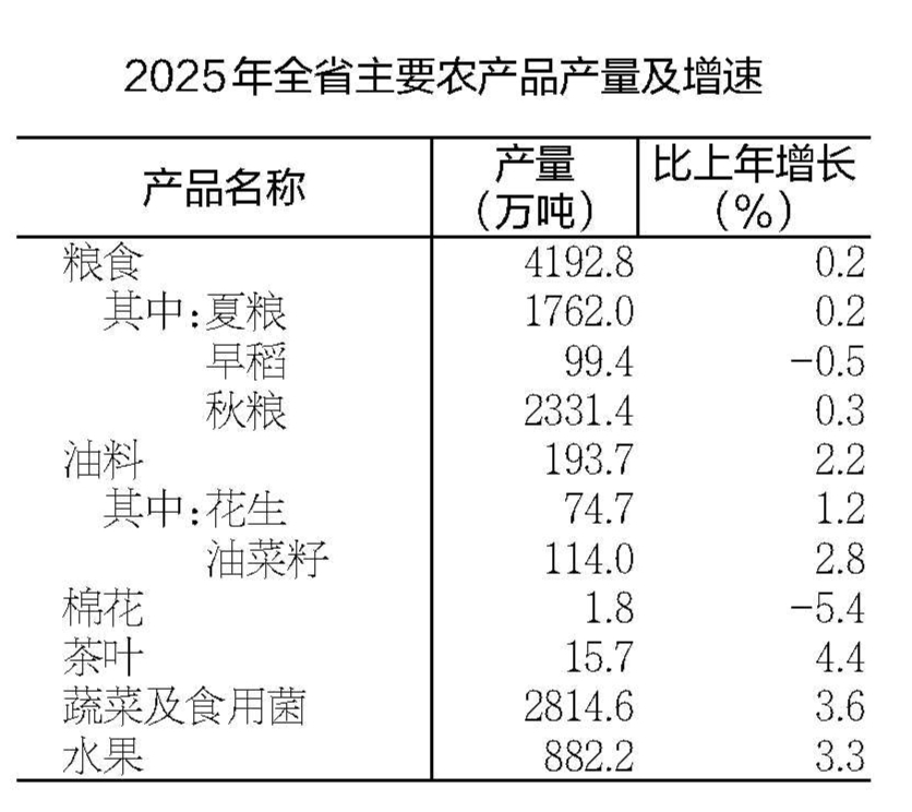 全年粮食种植面积11041.7万亩,比上年增加24.4万亩。油料种植面积1007.2万亩,增加9.1万亩。粮食产量4192.8万吨,比上年增产0.2%。其中,夏粮1762.0万吨,增产0.2%;早稻99.4万吨,减产0.5%;秋粮2331.4万吨,增产0.3%。油料产量193.7万吨,增产2.2%。