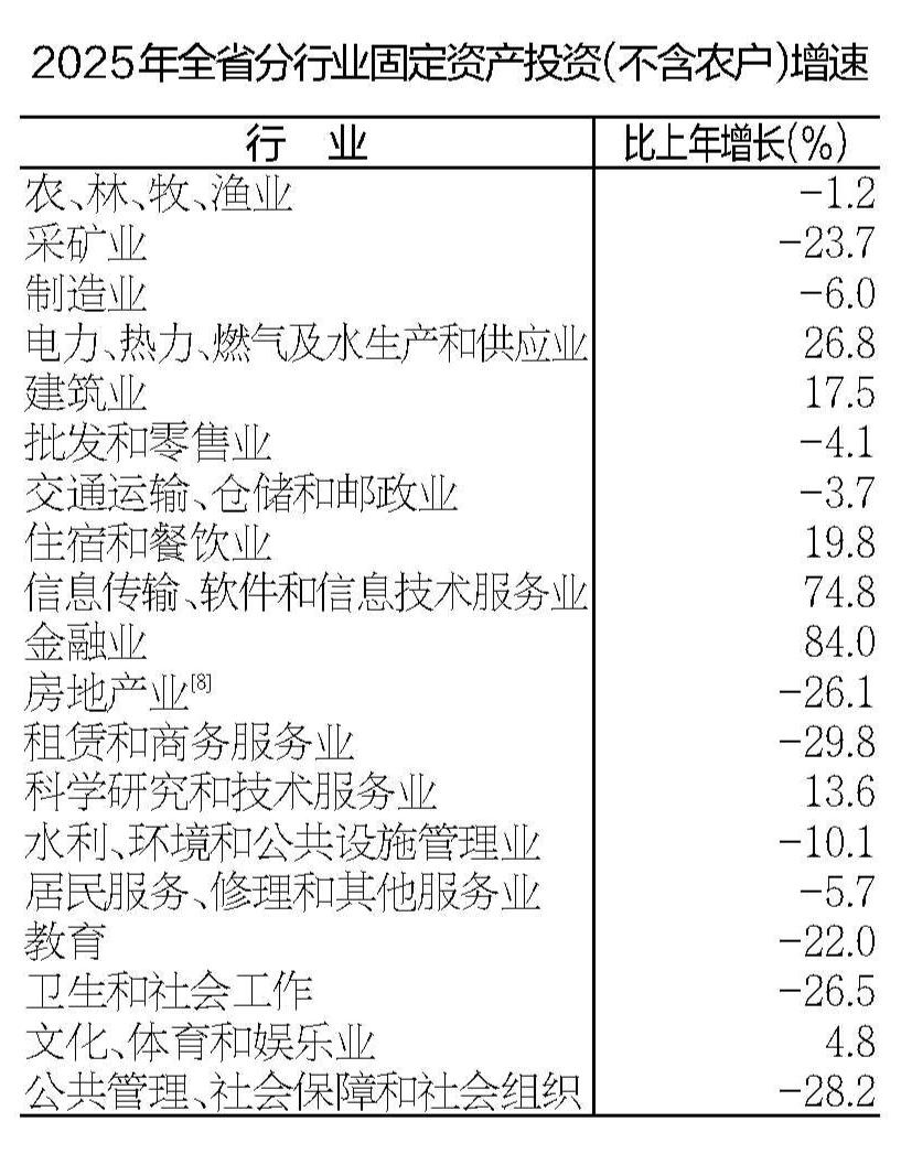 全年固定资产投资(不含农户)比上年下降9.2%。分产业看,第一产业投资下降0.7%,第二产业投资下降2%,第三产业投资下降14.7%。基础设施投资下降3.7%。民间投资下降8.4%。