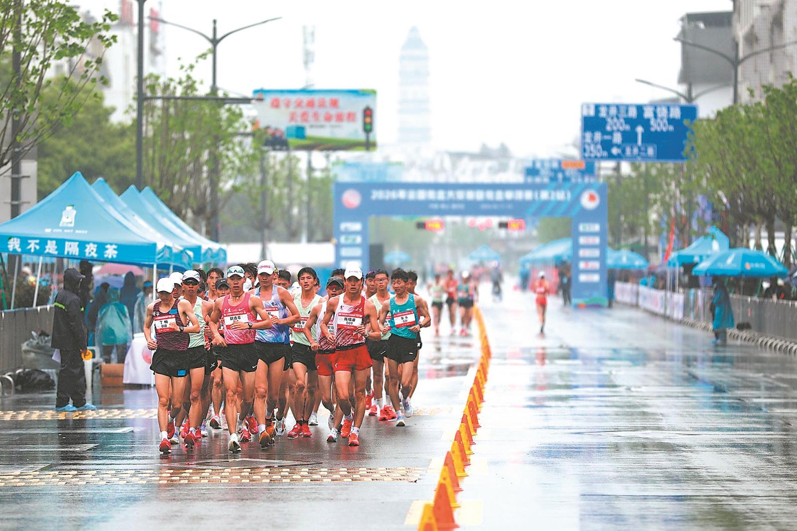 4月11日,由中国田径协会、安徽省体育局主办的2026年全国竞走大奖赛暨竞走单项赛(第2站)在黄山市徽州区开赛,来自全国21个省市247名运动员参加。图为参赛运动员在成年组半程马拉松竞走中展开激烈比拼。