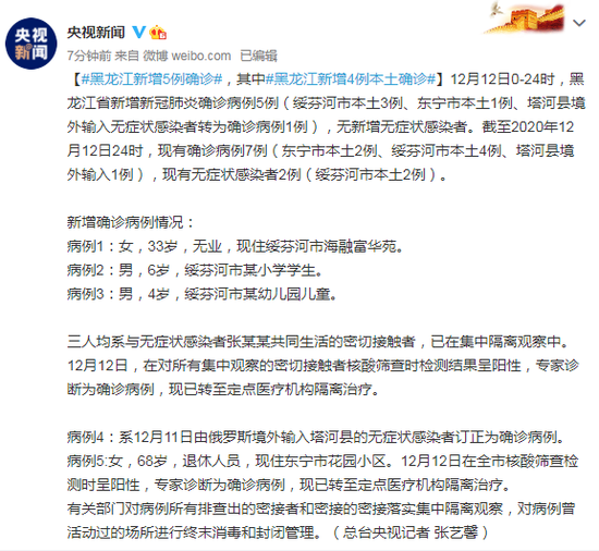 12月12日0-24时,黑龙江省新增新冠肺炎确诊病例5例(绥芬河市本土3例、东宁市本土1例、塔河县境外输入无症状感染者转为确诊病例1例),无新增无症状感染者。截至2020年12月12日24时,现有确诊病例7例(东宁市本土2例、绥芬河市本土4例、塔河县境外输入1例),现有无症状感染者2例(绥芬河市本土2例)。