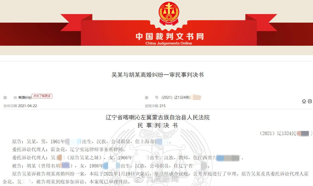 近日,中国裁判文书网公布一份民事判决书,判决不准许原告吴某与被告胡某离婚。