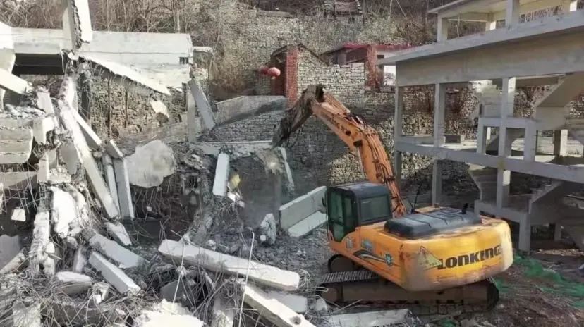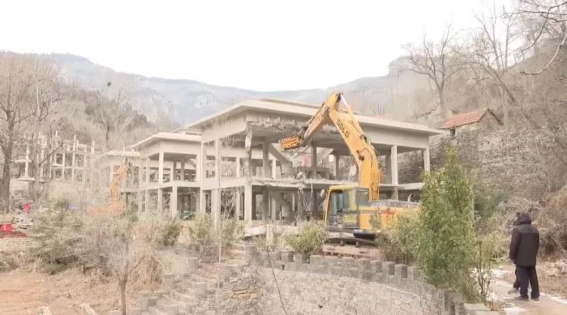 1月14日下午,按照现场研究确定的处置方案,济南南部山区管委会组织专门力量对位于天井峪村的新建民宿项目进行拆除。