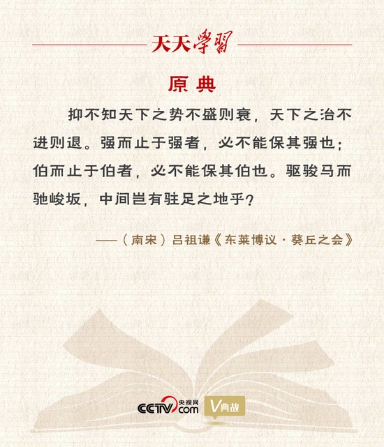 “天下之势不盛则衰,天下之治不进则退”出自《东莱博议》卷十一《葵丘之会》,是吕祖谦就齐桓公葵丘会盟发的一篇议论,意思是:天下大势此消彼长,如果不能继续强盛就会走向衰落;国家治理不进则退,如果不能继续前进就会走向倒退。事实也正是如此。通过葵丘会盟,齐桓公成为春秋时期的首位霸主,登上霸业的顶峰。葵丘会盟后,齐桓公志得意满,特别是在管仲去世后,任用易牙、竖刁、开方等一批小人,日益走向昏庸,齐国国势也逐渐衰落。对此,吕祖谦认为,无论诸侯、公伯还是霸主,如果“强而止于强”“伯而止于伯”,那么强者“必不能保其强也”,伯者“必不能保其伯也”。