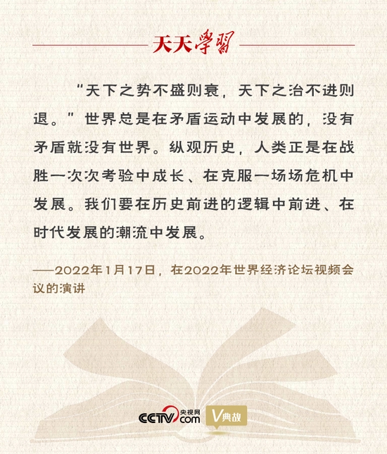 1月17日,习近平主席在北京出席2022年世界经济论坛视频会议并发表题为《坚定信心 勇毅前行 共创后疫情时代美好世界》的演讲,阐释中国理念和主张。习主席指出,当今世界正在经历百年未有之大变局。这场变局不限于一时一事、一国一域,而是深刻而宏阔的时代之变。时代之变和世纪疫情相互叠加,世界进入新的动荡变革期。