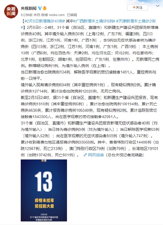 2月5日0—24时,31个省(自治区、直辖市)和新疆生产建设兵团报告新增确诊病例43例。其中境外输入病例30例(上海12例,广东7例,福建3例,四川3例,浙江2例,江苏1例,河南1例,广西1例),含9例由无症状感染者转为确诊病例(四川3例,浙江2例,江苏1例,河南1例,广东1例,广西1例);本土病例13例(广西6例,均在百色市;天津2例,均在河北区;河北2例,均在廊坊市;北京1例,在朝阳区;湖南1例,在邵阳市;广东1例,在惠州市)。无新增死亡病例。新增疑似病例1例,为境外输入病例(在上海)。
