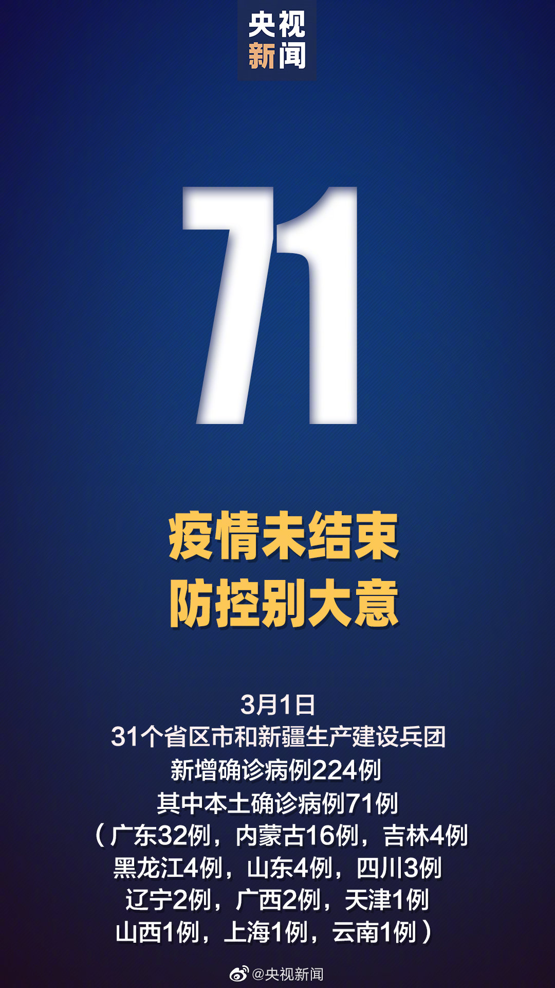 3月1日0—24时,31个省(自治区、直辖市)和新疆生产建设兵团报告新增确诊病例224例。其中境外输入病例153例(广东83例,上海37例,湖北10例,北京5例,天津3例,广西3例,四川3例,山东2例,重庆2例,云南2例,福建1例,河南1例,湖南1例),含10例由无症状感染者转为确诊病例(广东8例,湖南1例,云南1例);本土病例71例(广东32例,其中深圳市25例、东莞市6例、珠海市1例;内蒙古16例,均在呼和浩特市;吉林4例,均在延边朝鲜族自治州;黑龙江4例,其中哈尔滨市2例、牡丹江市2例;山东4例,均在青岛市;四川3例,均在成都市;辽宁2例,均在葫芦岛市;广西2例,均在防城港市;天津1例,在滨海新区;山西1例,在晋中市;上海1例,在普陀区;云南1例,在德宏傣族景颇族自治州),含2例由无症状感染者转为确诊病例(均在四川)。无新增死亡病例。新增疑似病例4例,均为境外输入病例(均在上海)。