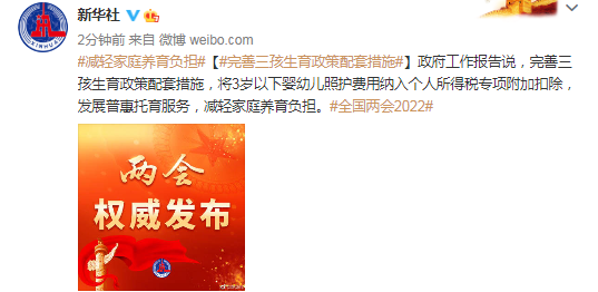 政府工作报告说,完善三孩生育政策配套措施,将3岁以下婴幼儿照护费用纳入个人所得税专项附加扣除,发展普惠托育服务,减轻家庭养育负担。