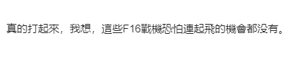不少台网友在新闻下方留言称,“有用吗?自己骗自己”“真的打起来,我想,这些F16战机恐怕连起飞的机会都没有”“执政者不才,累死三军”。