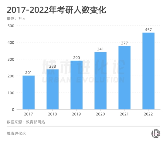 2022年全国考研报名人数457万,相比2021年,增加了80万人。有统计显示,“最热之一”的深圳大学,报考人数达到了近三万人。其他双非院校,报考人数都平均上涨了50%。这里面既有应届毕业生,往届生的占比也在明显上升。