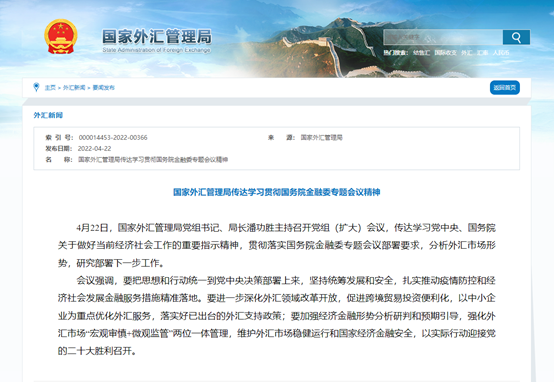 4月22日,国家外汇管理局党组书记、局长潘功胜主持召开党组(扩大)会议,传达学习党中央、国务院关于做好当前经济社会工作的重要指示精神,贯彻落实国务院金融委专题会议部署要求,分析外汇市场形势,研究部署下一步工作。