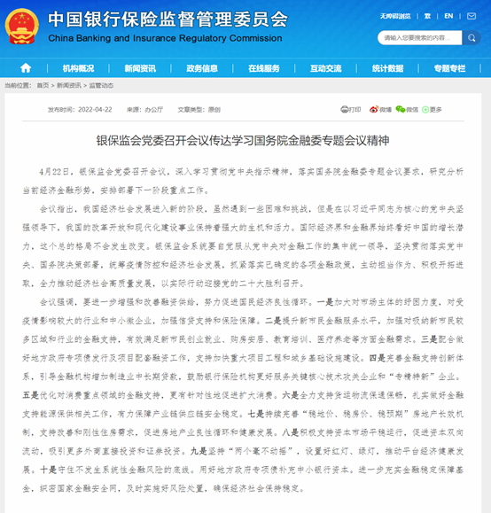 4月22日,央行、银保监会、证监会、国家外汇管理局纷纷传达学习贯彻国务院金融委专题会议精神,一行两会一局分析研判了前经济金融形势,研究部署下一阶段重点工作。