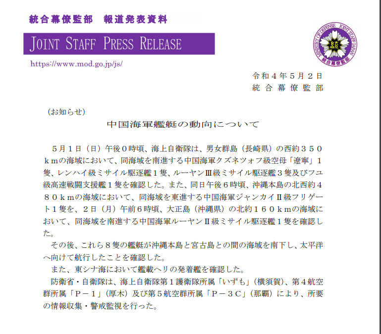 日本自卫队统合幕僚监部12月17日深夜通报称,海自于5月1日上午12时左右(当地时间),在距长崎县男女群岛以西约350千米的东海海域发现包括“南昌”舰、“辽宁”舰在内的5艘中国海军航母编队向东南方向航行,随后,该编队2日午后与冲绳县大正岛以西160公里的“郑州”舰和“湘潭”舰汇合,随后编队2日晚些时候穿过宫古海峡,进入太平洋南下。