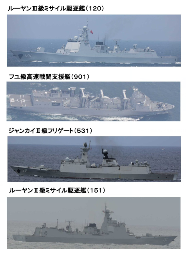 日本自卫队观测到的航母编队包括航母“辽宁”舰,055型驱逐舰“南昌”舰(舷号101)、052D型驱逐舰“西宁”舰(舷号117)、“乌鲁木齐”舰(舷号118)、“成都”舰(舷号120),052C型导弹驱逐舰“郑州”舰(舷号151)、054A型护卫舰“湘潭”舰(舷号531),综合补给舰“呼伦湖”舰(舷号901)。