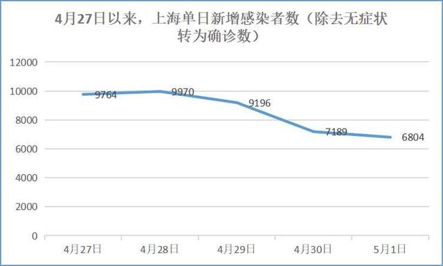 健康时报记者根据上海卫健委每日发布的数据发现,从4月27日,单日新增感染者的数量已经5天在1万例以下了。从4月27日到5月1日,除去既往无症状感染者转归的确诊患者,4月27日新增感染者9764例,4月28日新增感染者9970例,4月29日新增感染者9196例,4月30日新增感染者7189例,5月1日新增感染者6804例