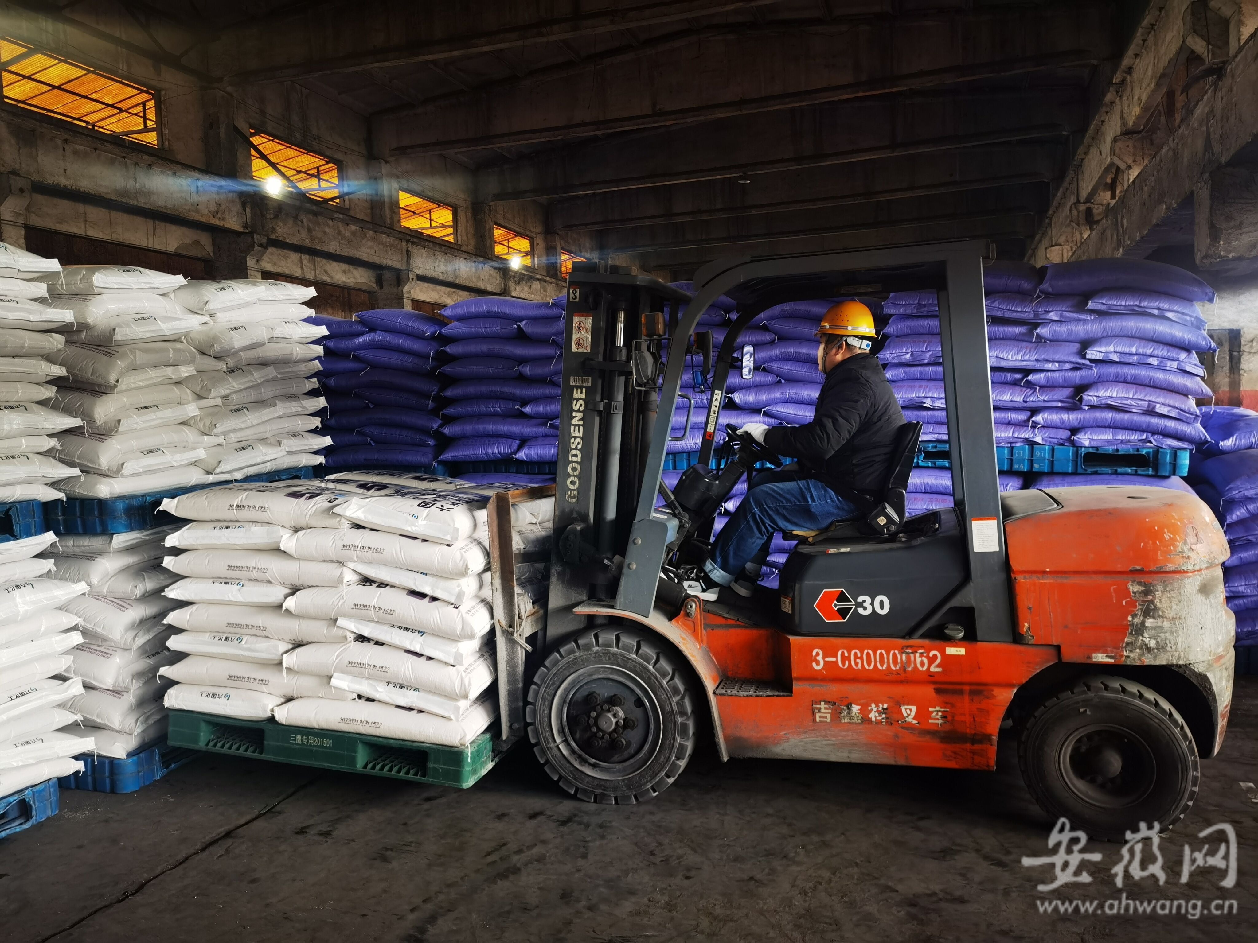 安徽六国化工股份有限公司专用线内,工作人员在装运化肥。