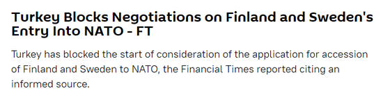 [环球网报道]英国《金融时报》刚刚援引知情人士的话报道称,土耳其阻止了对芬兰瑞典加入北约谈判的开启。