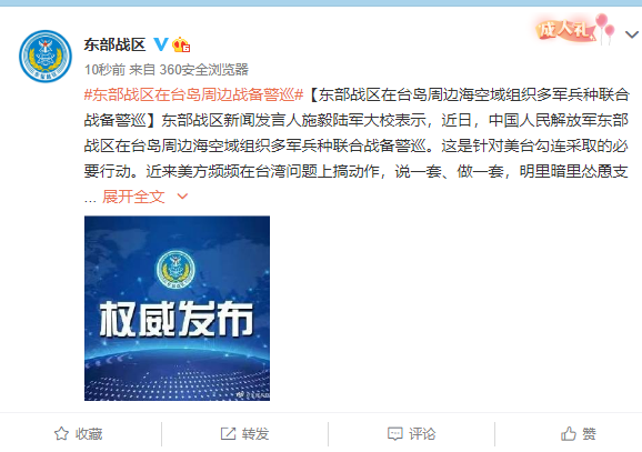 东部战区新闻发言人施毅陆军大校表示,近日,中国人民解放军东部战区在台岛周边海空域组织多军兵种联合战备警巡。这是针对美台勾连采取的必要行动。近来美方频频在台湾问题上搞动作,说一套、做一套,明里暗里怂恿支持“台独”势力,将把台湾推向危险境地,自身也将面临严重后果。台湾是中国的一部分。战区部队持续加强练兵备战,不断提高履行使命能力,坚决挫败任何外部势力干涉和“台独”分裂图谋。