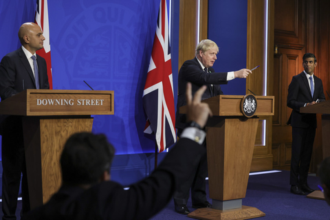 英国卫生大臣贾维德和财政大臣苏纳克7月5日辞职。这是2021年9月7日,英国首相约翰逊(中)、卫生大臣贾维德(左)和财政大臣苏纳克在伦敦出席新闻发布会。新华社发(英国首相府供图)