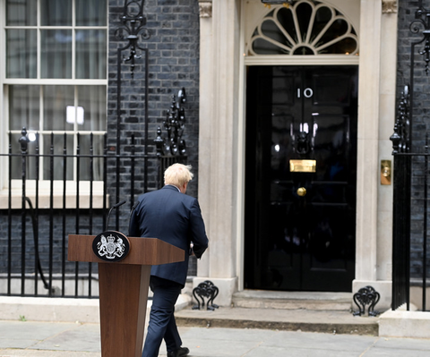 7月7日,英国首相鲍里斯·约翰逊在伦敦唐宁街10号门前发表讲话后离开。新华社记者李颖摄