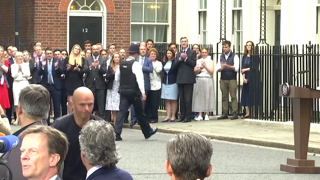 在周四约翰逊从唐宁街10号走出来时,英国首相府外面的人群爆发出阵阵掌声和欢呼声。但他们中的大多数,并不是来支持约翰逊的,而是来庆祝约翰逊宣布辞职的,还有人拿着高音喇叭播放“Bye bye Boris(约翰逊,再见)”。