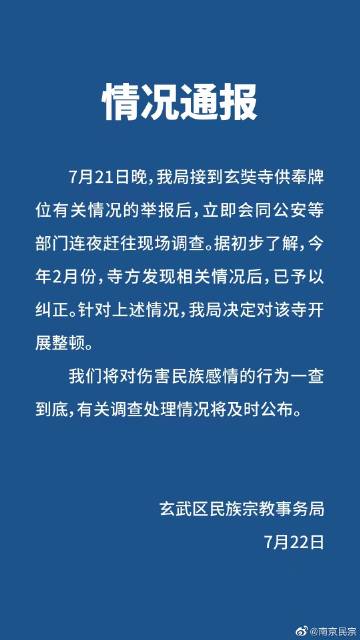 7月22日清晨,南京市民族宗教事务局官方微博(@南京民宗)发布情况通报称,21日晚,我局接到玄奘寺供奉牌位有关情况的举报后,立即会同公安等部门连夜赶往现场调查。据初步了解,今年2月份,寺方发现相关情况后,已予以纠正。针对上述情况,我局决定对该寺开展整顿。