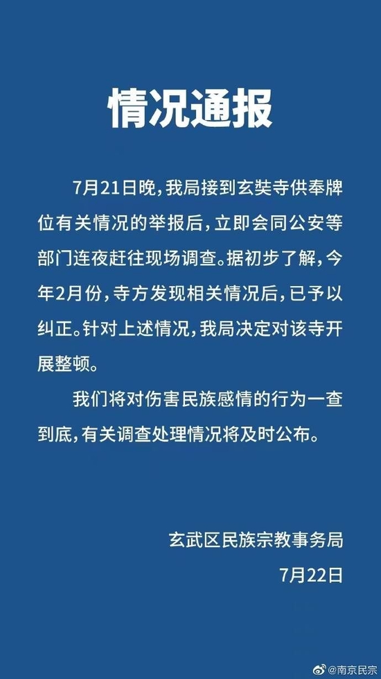 7月22日下午,南京市委宣传部新闻发布官方微博“南京发布”公布了“南京玄奘寺供奉日本战犯牌位事件”的处理情况,责令玄奘寺停止日常活动,并会同相关部门立即对其进行整顿,并对玄奘寺主要负责人、南京市民族宗教事务局负责人、玄武区民族宗教事务局负责人等4人分别予以撤职、免职、诫勉、停职检查等处分。同时,南京市玄武区玄武门派出所工作人员称,已对疑似设立战犯牌位的“吴啊萍”开展身份核实工作,后续调查情况以官方通报为准。