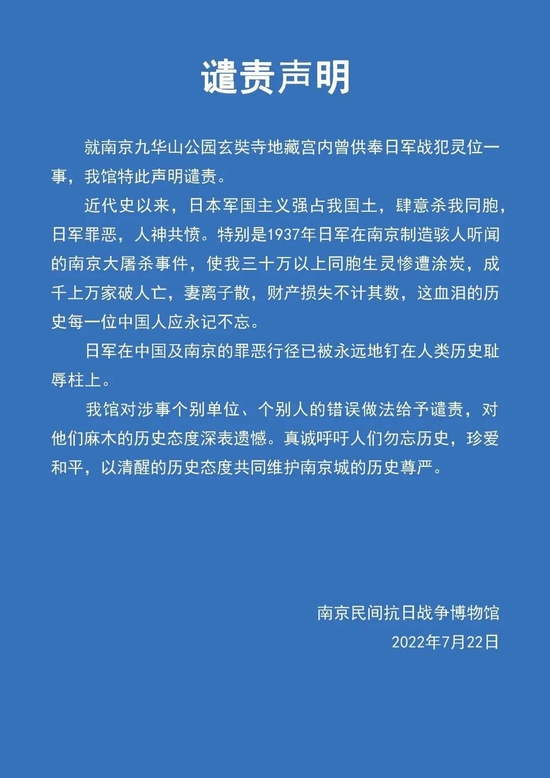 有网友发文表示,在南京九华山公园玄奘寺地藏殿内,一排长生牌位竟然供奉着侵华日军战犯。此消息一出,引发国人震怒。7月22日凌晨,南京玄武区民族宗教事务局回应表示,将对伤害民族感情的行为一查到底。
