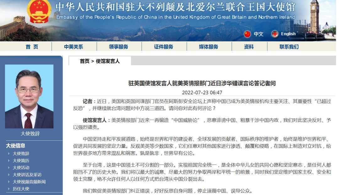 使馆发言人:美英情报部门近来一再编造“中国威胁论”,恶意诽谤中国、粗暴干涉中国内政,我们对此坚决反对、予以强烈谴责。