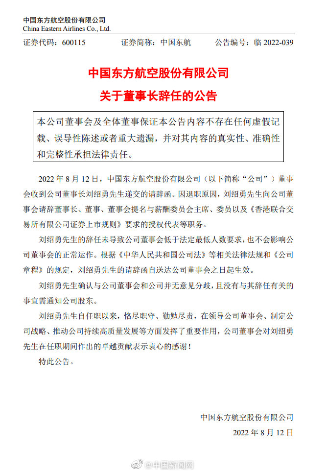 中国东航12日发布公告称,2022年8月12日,中国东方航空股份有限公司董事会收到公司董事长刘绍勇递交的请辞函。因退职原因,刘绍勇向公司董事会请辞董事长、董事、董事会提名与薪酬委员会主席、委员以及《香港联合交易所有限公司证券上市规则》要求的授权代表等职务。公告称,刘绍勇的辞任未导致公司董事会低于法定最低人数要求,也不会影响公司董事会的正常运作。(中新财经)