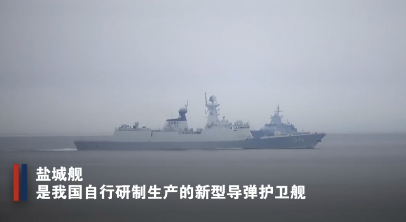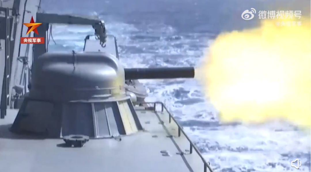 在日本海相关海域,由南昌舰、盐城舰、东平湖舰组成的中方舰艇编队组织对空实弹射击演练。南昌舰使用副炮射击,成功击毁数千米外的靶标。