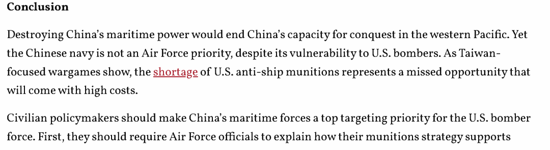 他还提出美国空军应该改变思路,尤其是美军的轰炸机应该把中国海军的目标优先级提到最高,认为要发挥美军在这方面的优势,才能打赢对中国的战争。
