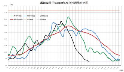 鄱阳湖星子站于8月6日、8月19日、9月6日相继刷新进入枯水期(12米以下)、低枯水期(10米以下)、极枯水期(8米以下)历史最早纪录,较原最早出现年份分别提前16天、40天、85天,较有记录以来(1951~2021)平均出现时间分别提前92天、98天、115天。9月23日6时,鄱阳湖星子站水位7.10米,刷新1951年有记录以来历史最低水位(7.11米,2004年2月4日)。