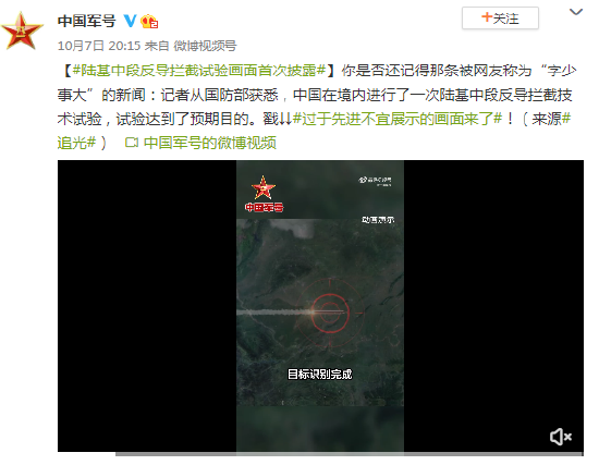 你是否还记得那条被网友称为“字少事大”的新闻:记者从国防部获悉,中国在境内进行了一次陆基中段反导拦截技术试验,试验达到了预期目的。戳↓↓#过于先进不宜展示的画面来了#!