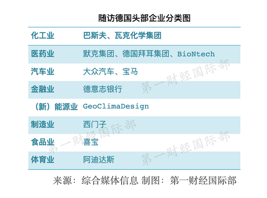 除了上文提到的企业,此次在随行名单上的德国头部企业还包括宝马、瓦克化学集团、阿迪达斯、婴儿食品制造商喜宝(Hipp)、加热技术公司GeoClimaDesign和德国拜耳集团。