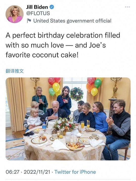 拜登此次低调庆祝了80岁生日。据白宫新闻发言人让-皮埃尔称,拜登当地时间20日在华盛顿庆祝生日,第一夫人吉尔举办了一场早午餐会。吉尔还在推特上发了一张他在家人陪伴下吹生日蜡烛的照片。