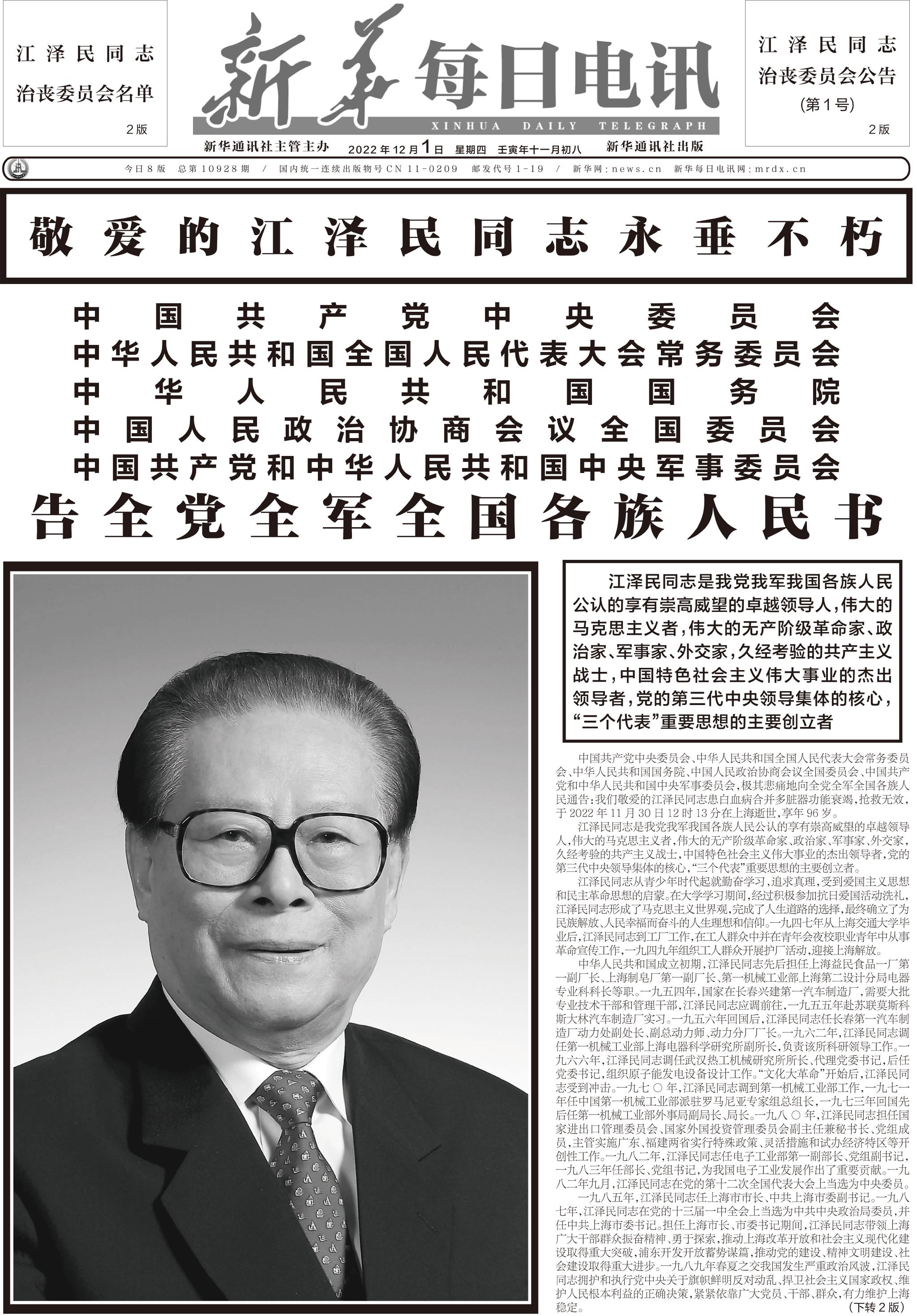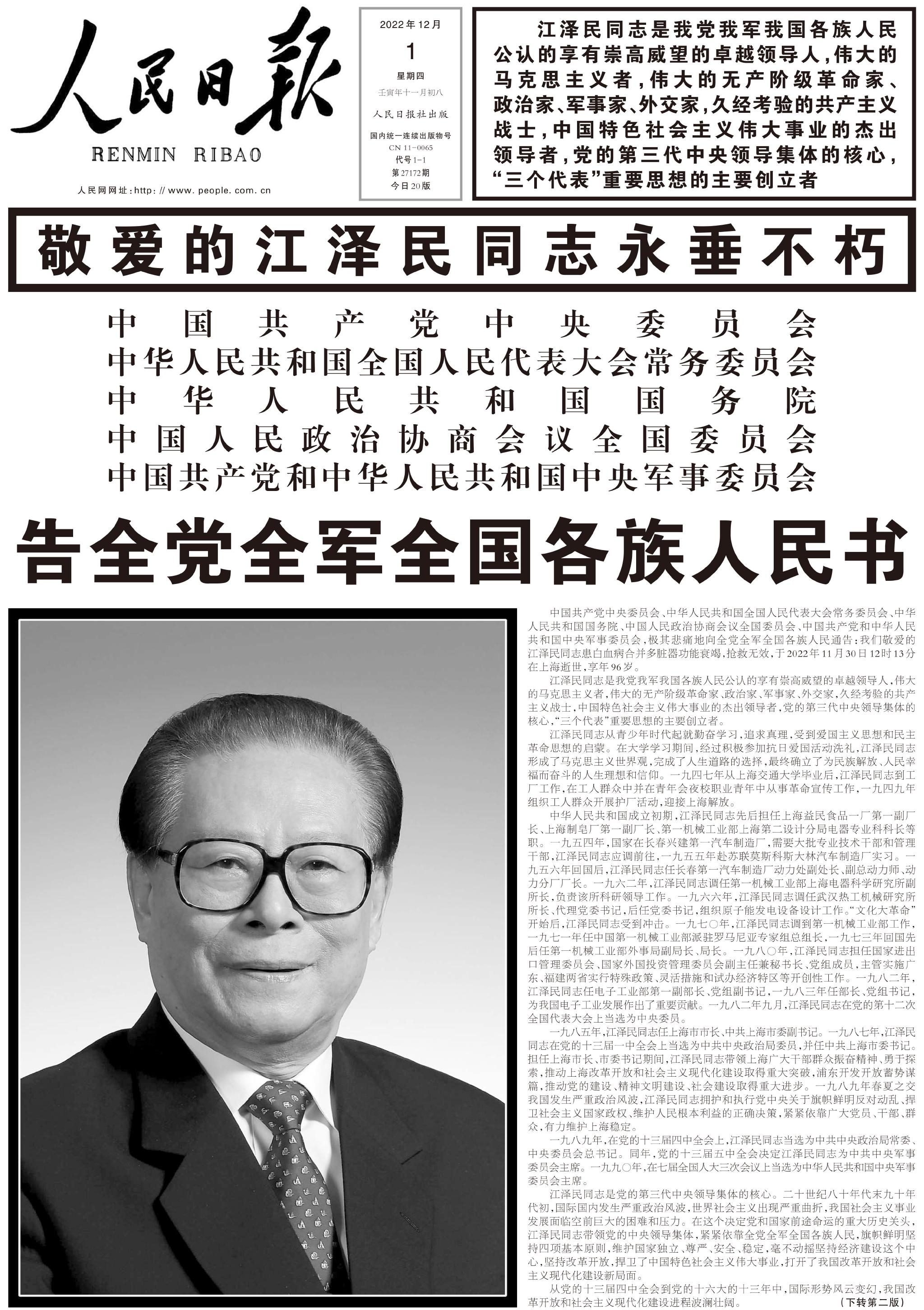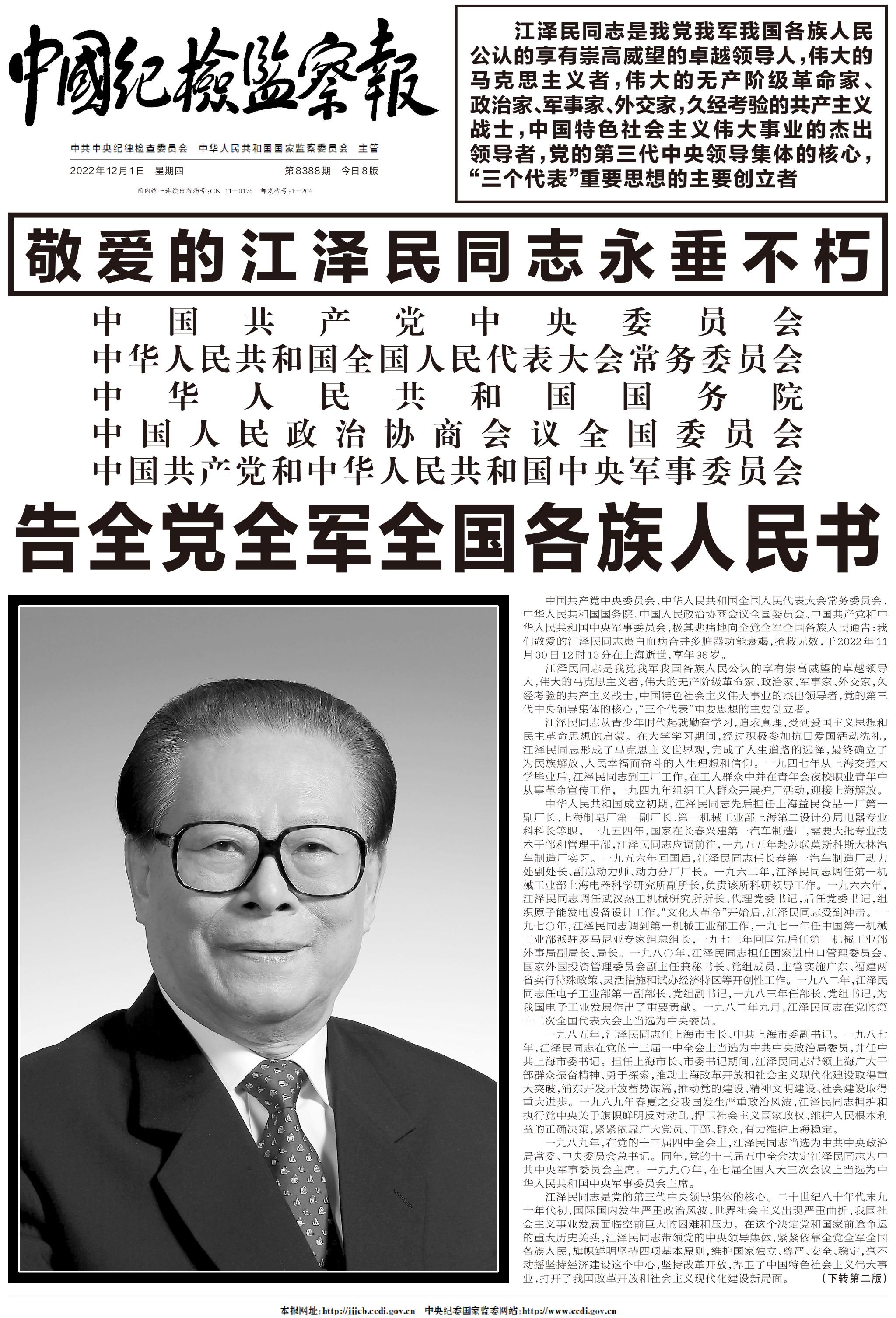 江泽民同志11月30日在上海逝世,享年96岁。12月1日出版的《人民日报》、《新华每日电讯》、《光明日报》、《解放军报》、《中国纪检监察报》、《经济日报》等央媒在头版集中发布告全党全军全国各族人民书。