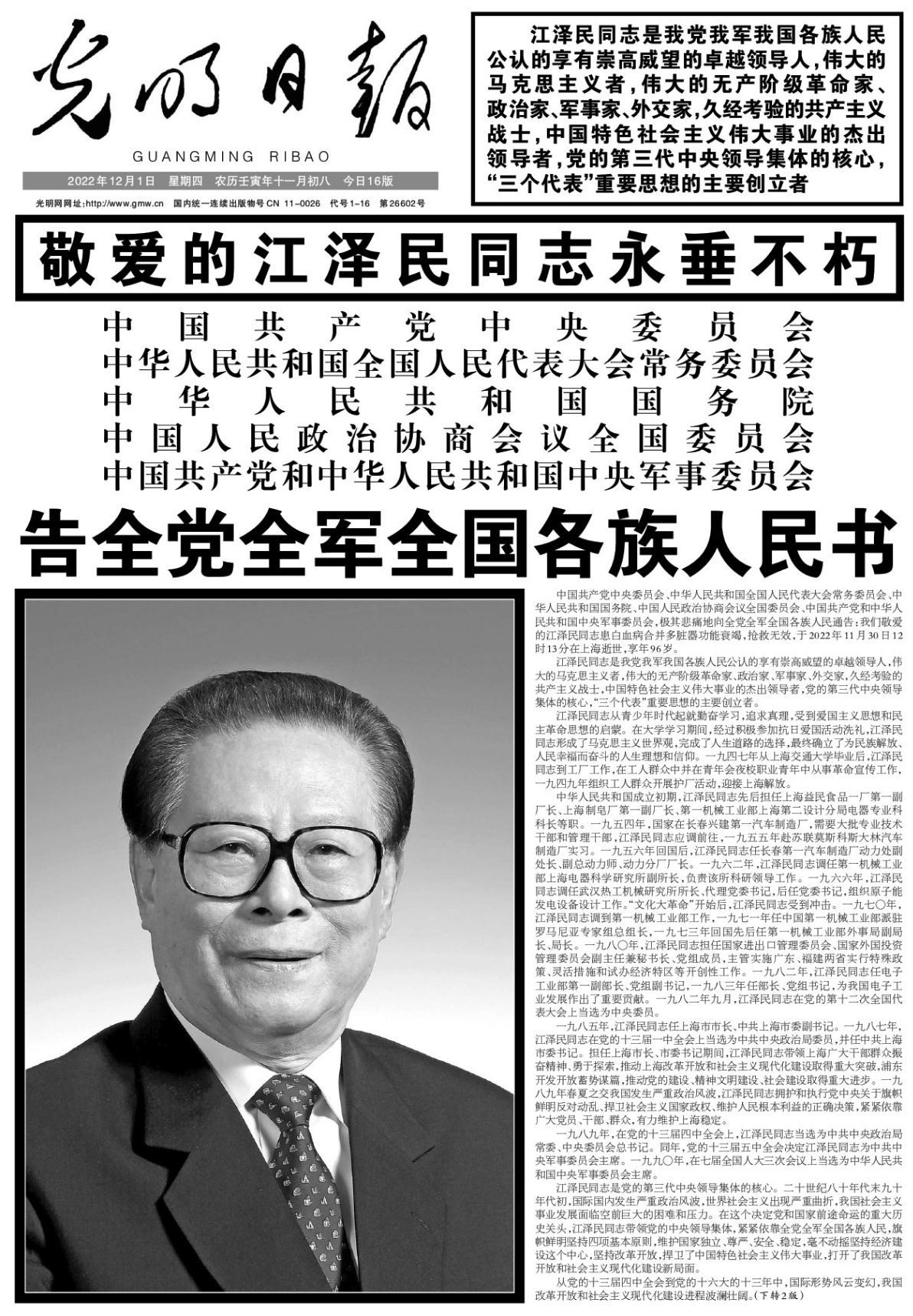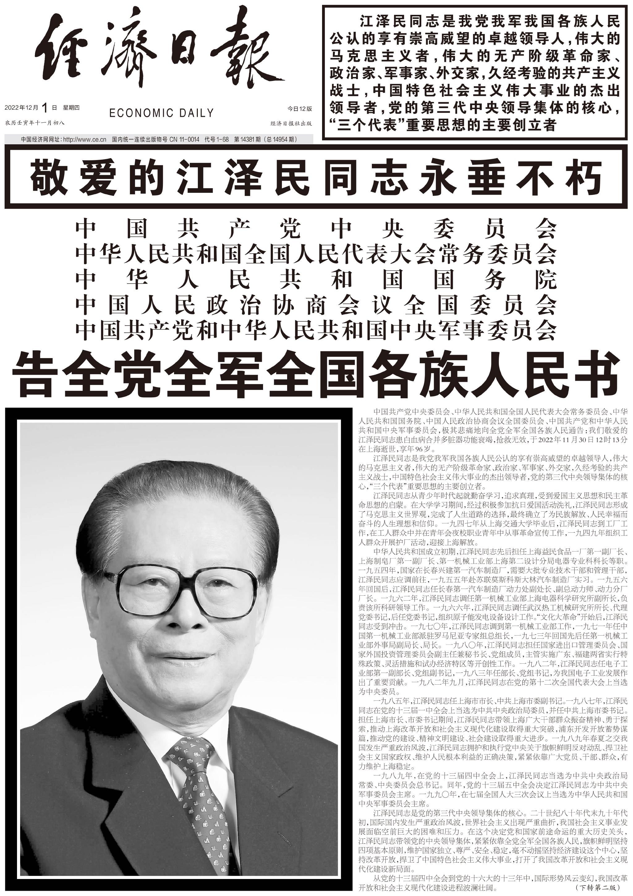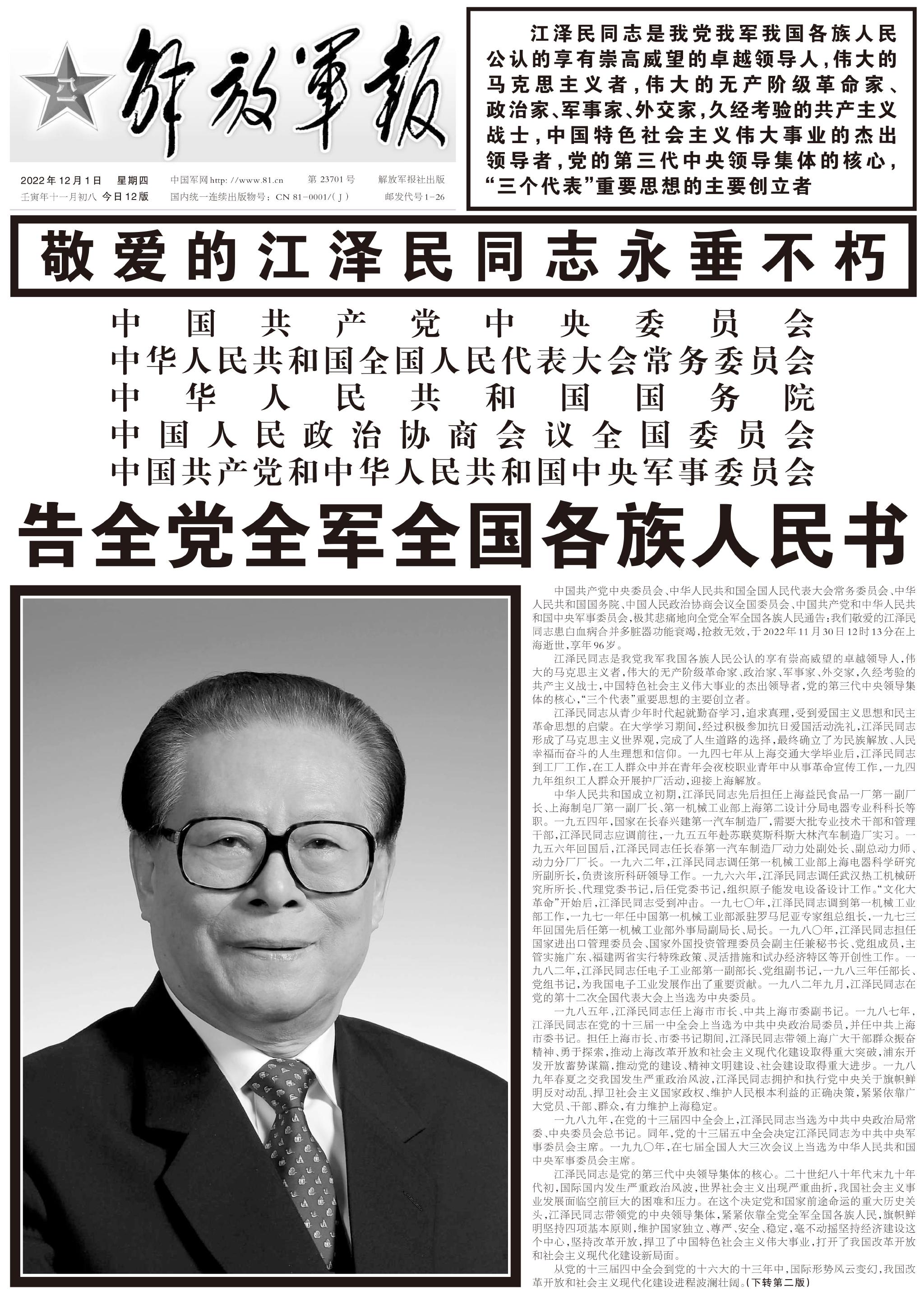 江泽民同志11月30日在上海逝世,享年96岁。12月1日出版的《人民日报》、《新华每日电讯》、《光明日报》、《解放军报》、《中国纪检监察报》、《经济日报》等央媒在头版集中发布告全党全军全国各族人民书。
