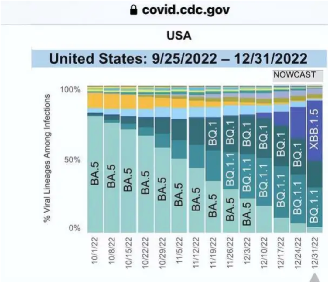据CDC数据显示,在截至2022年12月31日的一周,XBB.1.5毒株的感染比例环比接近翻番(此前一周的感染比例仅21.7%),XBB和XBB.1.5合计占全美感染病例总数的44.1%。美国科学家们认为,由于具有极高的“免疫逃逸”能力,XBB.1.5已经迅速取代BQ.1.1、BQ.1毒株,成为美国的头号流行毒株。