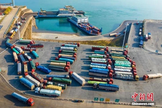 2022年12月下旬,长江三峡西陵峡段,江面船只往来穿梭,滚装码头全天候作业。图为繁忙的秭归滚装码头。郑家裕 摄